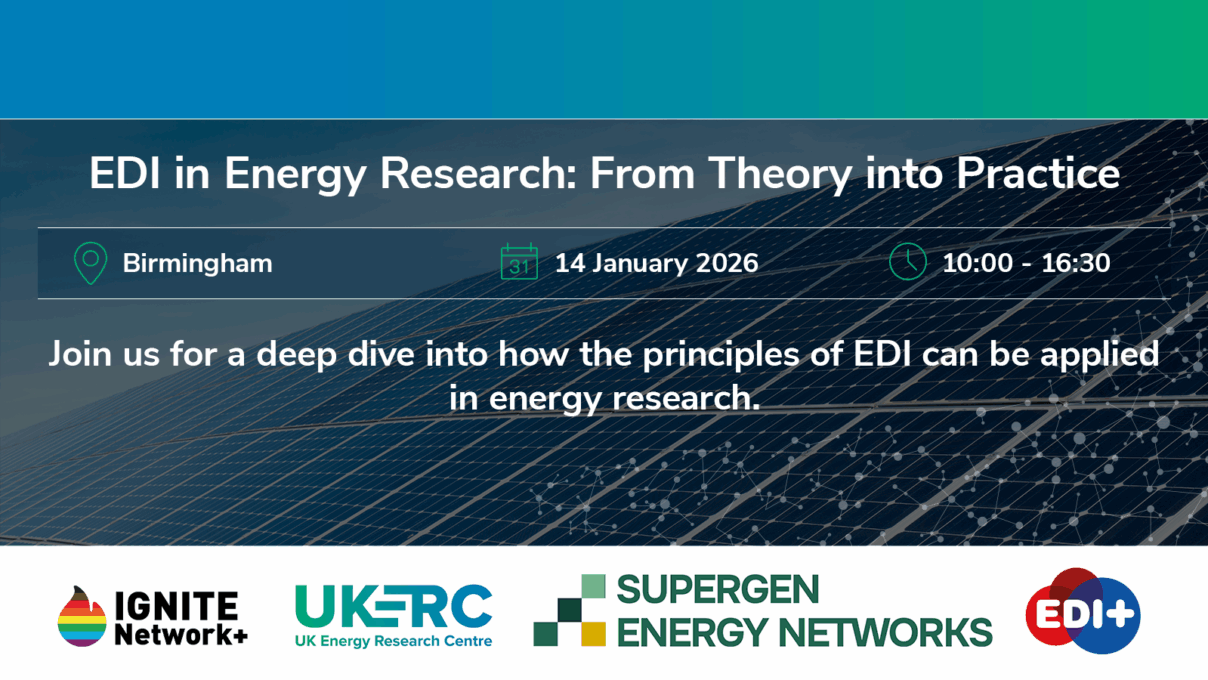 Discover how equality, diversity, and inclusion can move from theory into everyday practice across energy research. Co-hosted by UKERC, Supergen Energy Networks, EDI+, and IGNITE. This event is open to all, from early-career researchers to established professionals committed to fostering inclusive and equitable research environments.